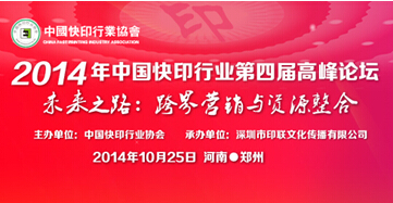 由中国快印行业协会主办,深圳市印联文化传播有限公司承办的中国快印行业一年一度的级别较高、规模较大的“2014年中国快印行业第四届高峰论坛”将于10月在河南郑州盛大召开!本届论坛以“跨界营销与资源整合”为主题,届时将邀请相关部门负责人、快印行业资深专家以及快印企业总裁等,就当前快印行业发展现状及未来发展趋势等焦点课题展开深入交流与互动!
